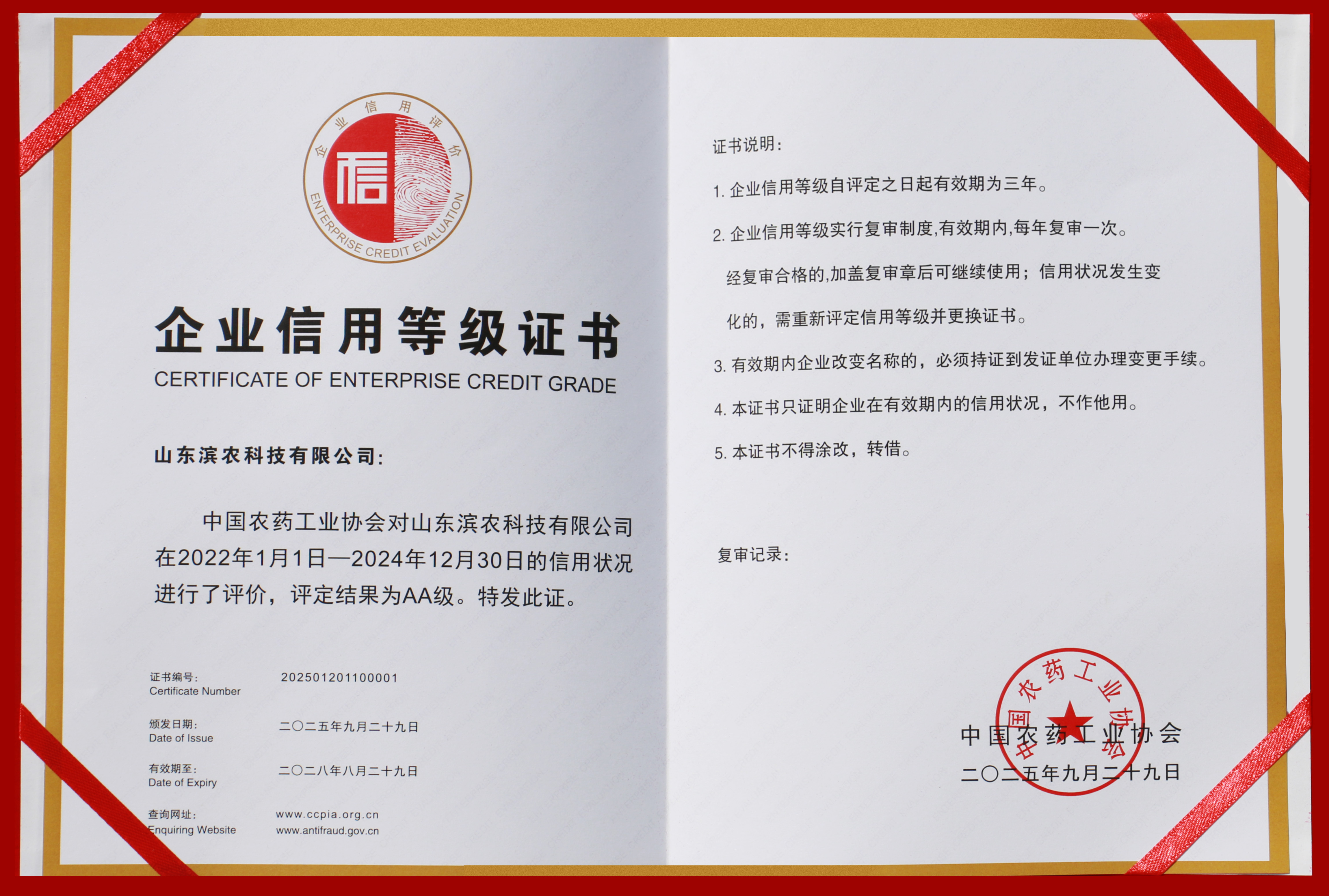 9月29日,中國農藥工業協會公布了 2022年1月1日 - 2024年12月30日期間農藥企業信用等級評價結果,濱農科技憑借規范經營、健全信用體系及突出社會責任,獲評 AA 級信用企業,有效期三年,標志著我公司信用管理水平與綜合競爭力獲國家級行業協會高度肯定。
