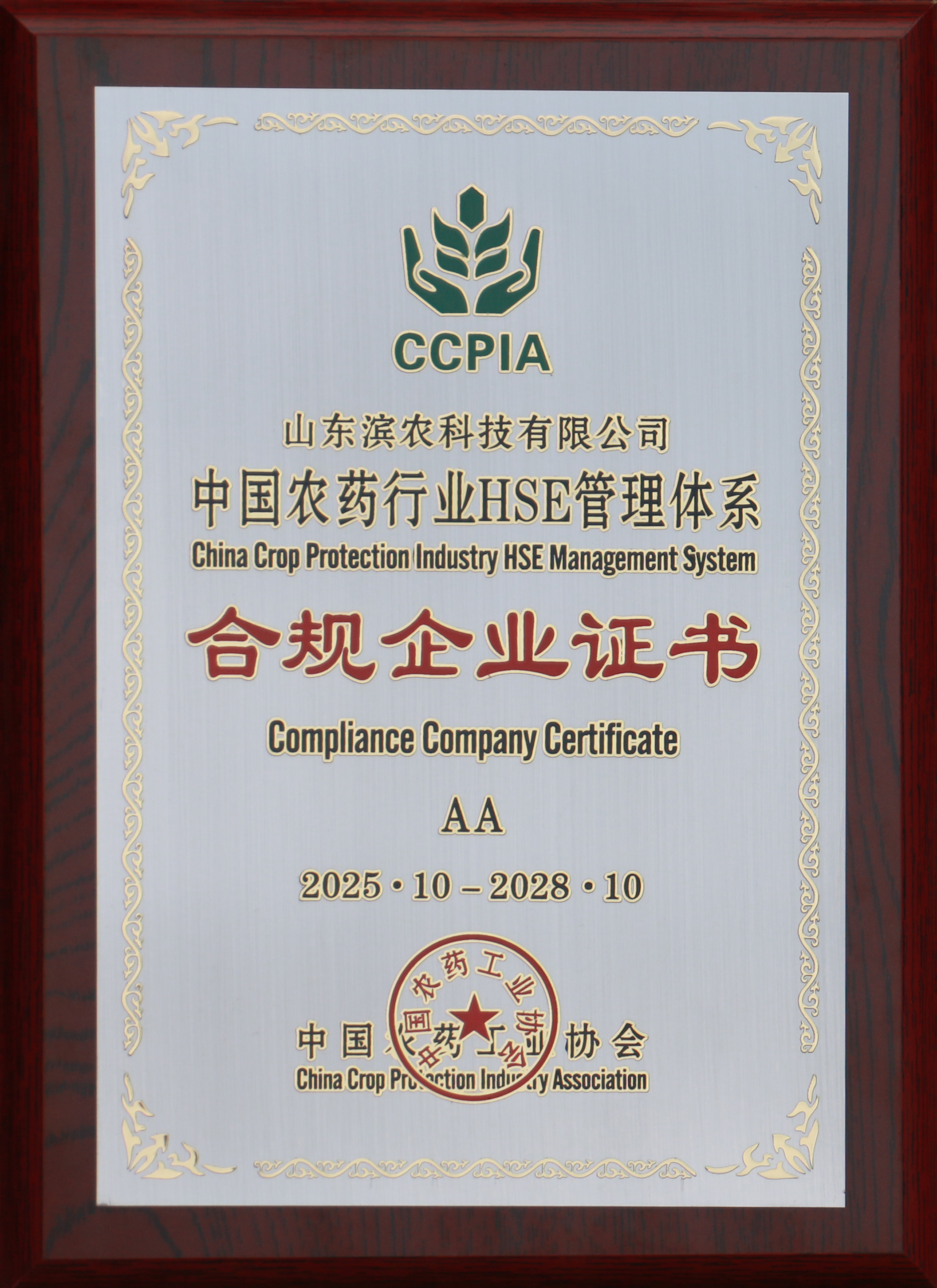 ■2025-11-13 濱農科技取得中國農藥行業HSE管理體系合規企業AA級認證