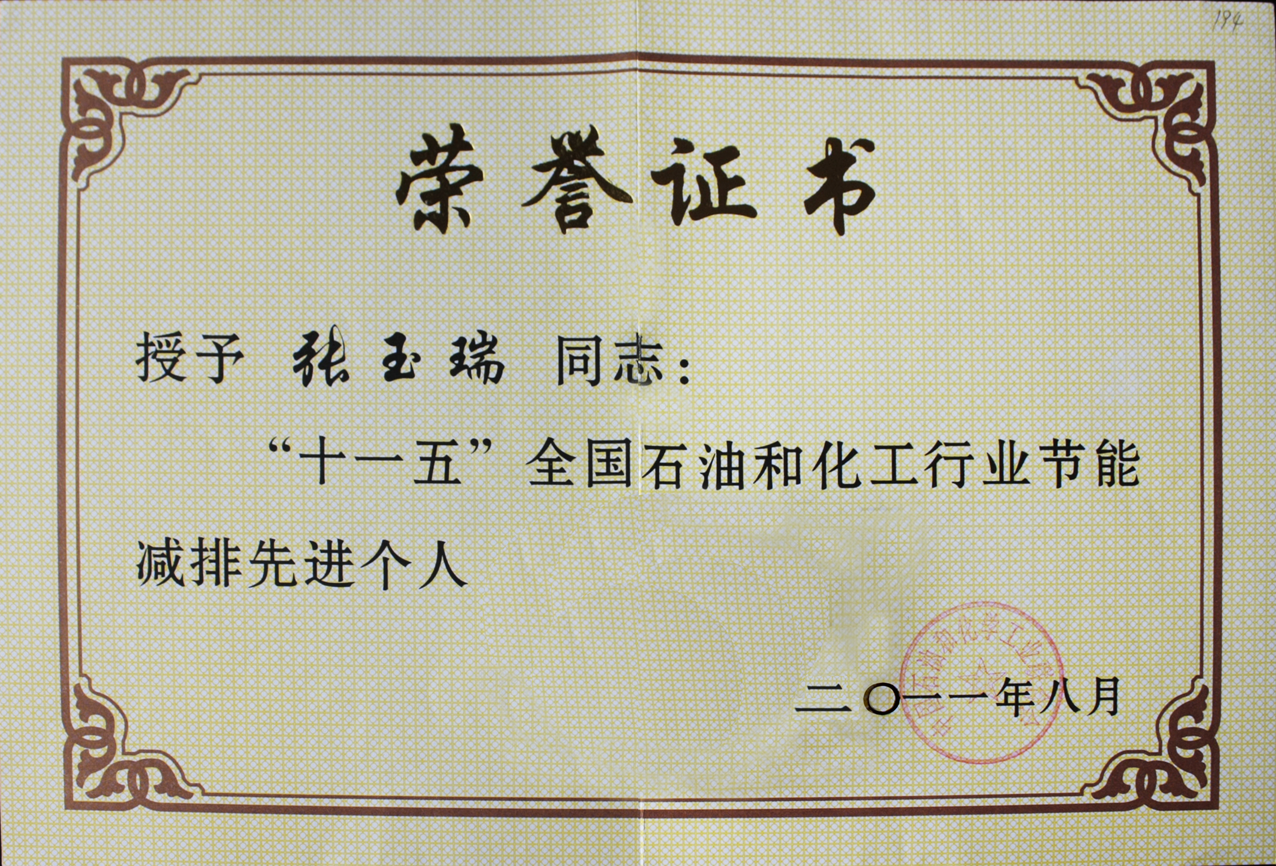 ■2011-08-05 我公司生產總監榮獲“十一五”全國石油和化工行業節能減排先進個人稱號