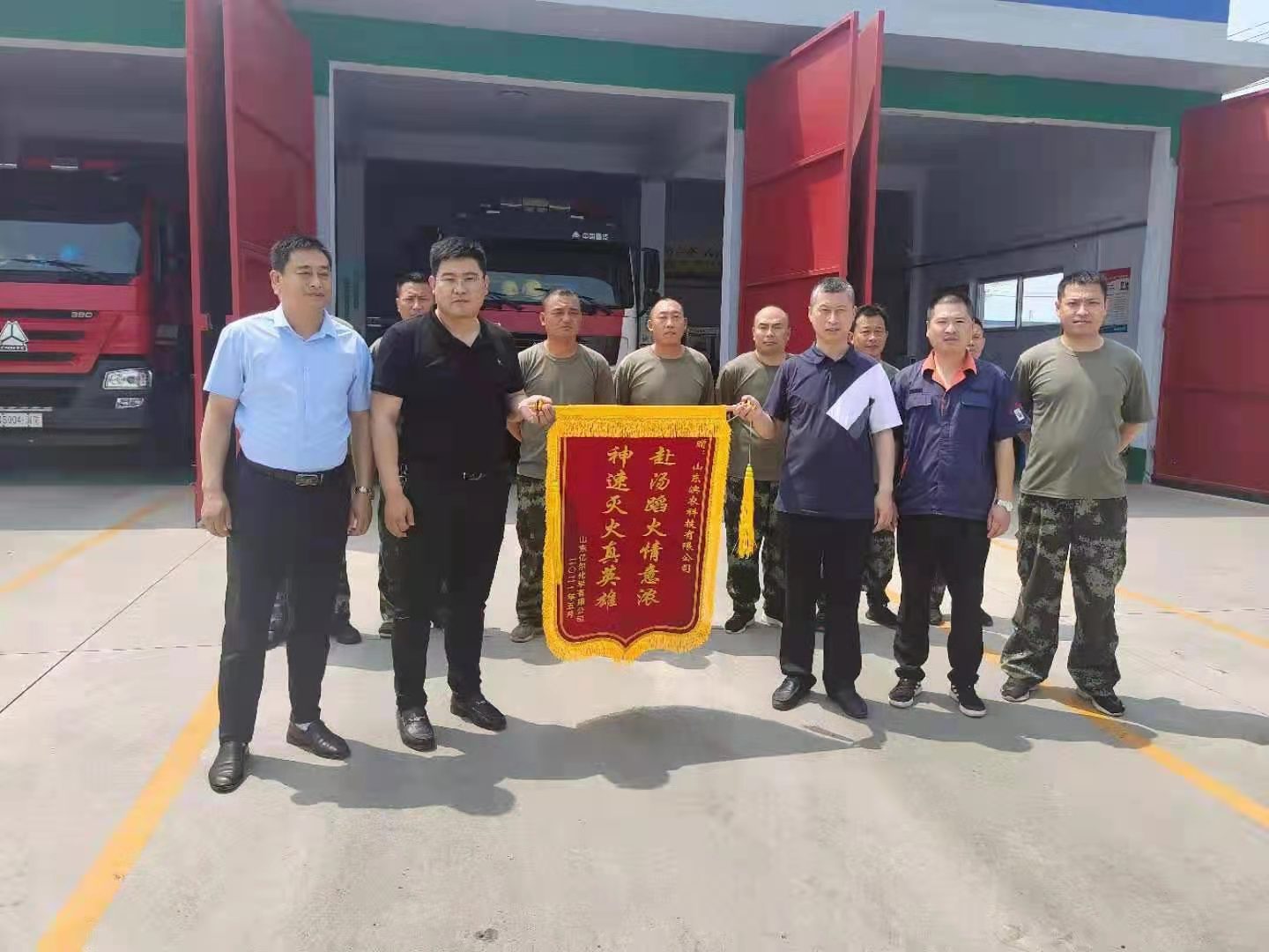 山東億爾化學為我公司消防隊送來錦旗發布時間:2021-07-13 14:516月 2日上午,我公司安全總監王艷彬、護衛隊主任顏丙凱代表公司收到了山東億爾化學公司贈送的印有“赴湯蹈火情意濃,神速滅火真英雄”的一面錦旗,億爾化學安全負責人對在5月29日火災撲救中快速出警、處置正確、不畏危險、英勇作戰的濱農科技消防隊指戰員表示衷心的感謝。王總和顏主任表示,一旦有險情發生,快速實現應急救援和全力保護園區消防安全是濱農消防隊應盡的職責,錦旗是對我們工作的肯定,也是對濱農消防隊莫大的鼓舞,今后將一如既往地為濱北工業園區創造平安、和諧、穩定的安全環境。 ![]() |