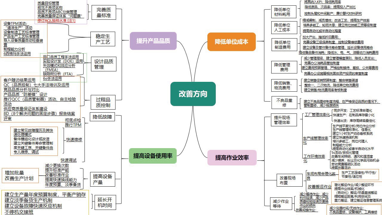精益改善辦根據(jù)車間日常改善中遇到的問題,將改善方向匯總成思維導(dǎo)圖形式供大家參閱,改善方向重點從8個方面做了詳細(xì)闡述。針對設(shè)備管理方面如何進(jìn)行改善,精益改善辦從公司精益管理微信群向大家定期發(fā)布《卓越班組TPM》知識,管理者可根據(jù)自己部門實際情況和班組長展開學(xué)習(xí),從降低故障率、提高設(shè)備產(chǎn)量、延長開機時間等方面,與安全管理相結(jié)合,緊密溝通設(shè)備管理部門的日常管理工作,將設(shè)備管理工作落地實施并有效運行。