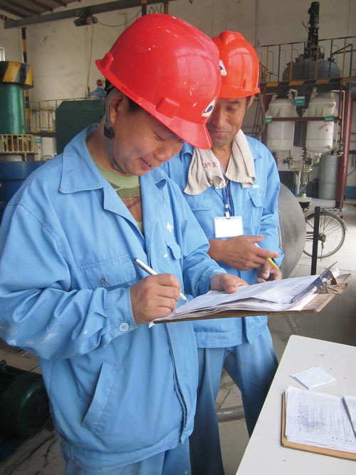 注重原材料控制,嚴把原料計量。在懸浮劑車間,什么原料存放在什么地點都是固定的,原料全部用標牌標注名稱,避免出現混料情況。由于一些員工不認秤不懂計量,就由車間倉庫保管員專門為領料員工計量過秤。保管員會嚴格按照配方含量要求計量,絕對不會出現錯料、少料、多料現象。幾年來,懸浮劑車間產品配方變化很小,但質量提升很大,完全得益于物料計量準確。以前出現過懸浮劑結塊質量不過關的現象,根本不是配方問題,而是由于計量不準確而打破了配方的配合比。對于剩余庫存,保管員在交接班時都要細細核查數量,并詳細填寫庫存清單。這樣可以及時發現發料問題,出現生產問題時還可以有效查詢。避免庫存不清,無法掌握發料投料情況。