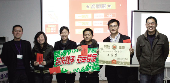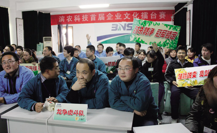 2009年12月10日下午,濱農科技首屆企業文化擂臺賽圓滿落下帷幕。本次擂臺賽的主要目的是促進企業文化理念及行為知識內化,加強員工學習企業文化的主動性積極性。主要出題范圍是企業文化手冊全部內容以及部分安全、產品知識,貼近企業實際。以企業文化培訓考評小組為單位,比賽共分成七支代表隊,每隊有三名選手和五名親友團隊員組成。整場比賽分必答題、搶答題、風險題三個環節,還為現場觀眾設置了觀眾題。公司總經理助理任立巖擔任總裁判。