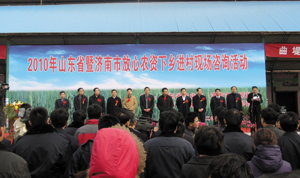 2010年3月23日上午,2010年“山東省暨濟南市放心農資下鄉咨詢活動”在濟陽曲提鎮菜市場舉行。本次活動由山東省農業廳、濟南市政府和濟陽市政府聯合舉辦。會場選在鎮政府菜市場當中,人流如織,賣菜的農民順便參與到活動之中。濱農是山東農藥企業唯一的代表,公司帶去了適合當地使用的除草劑、殺蟲殺菌劑產品和宣傳材料;顒又袕V大農民對我們的產品十分感興趣,我們詳細解答了農民朋友在使用中遇到的諸多實際問題。本次活動是去年我們所參加的省政府兩次活動的繼續,對提升濱農品牌的知名度十分有意義。