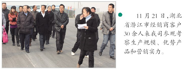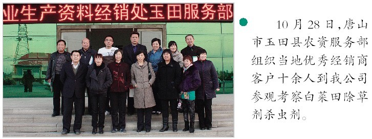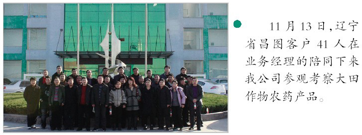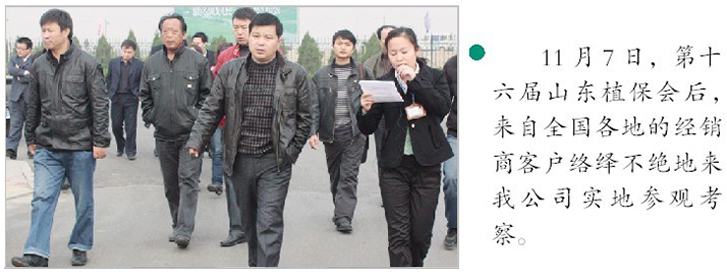時間:2012-08-10 14:56隨著濱農(nóng)品牌美譽度的不斷提升,各地客戶對濱農(nóng)的認同度不斷加深。初冬時節(jié),農(nóng)化市場進入銷售淡季,全國各地經(jīng)銷商客戶紛紛慕名來我司參觀考察,意在全方位考察我公司生產(chǎn)實力、產(chǎn)品特色、新品上市等情況。公司解說員張娜、常海燕、舒麗麗與公司隨行業(yè)務人員分別向一批批客戶介紹著濱農(nóng),并陪同客戶朋友們實地參觀制劑生產(chǎn)線、成品倉庫、研究所等,及時向客戶解疑答惑。來訪客戶紛紛表示,通過參觀他們更真實的了解了濱農(nóng)的生產(chǎn)規(guī)模、產(chǎn)品結構及綜合實力,與濱農(nóng)的合作前景更加廣闊,信心更加堅定。