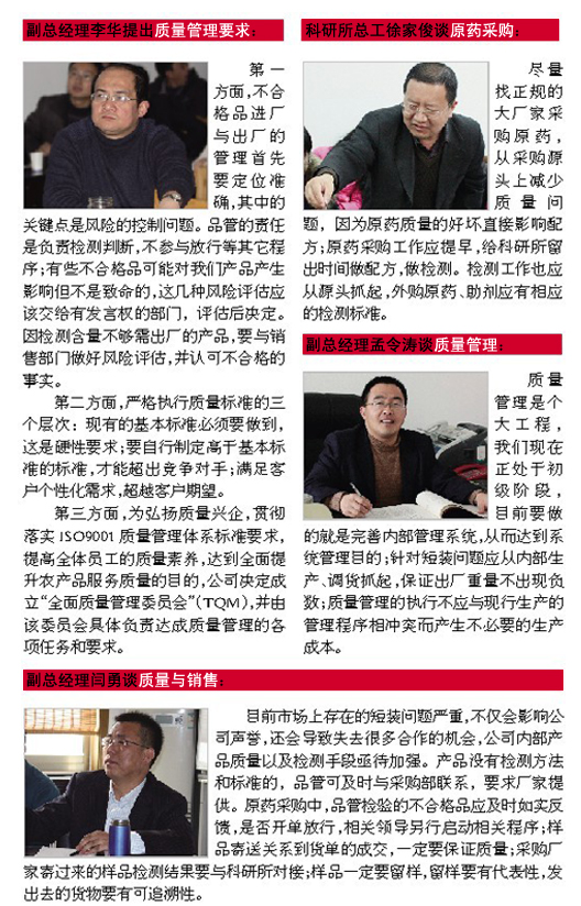 在本月質(zhì)量管理月度例會上,公司部分高層管理者針對自己負(fù)責(zé)板塊存在的質(zhì)量隱患和改進(jìn)措施提出意見和建議: