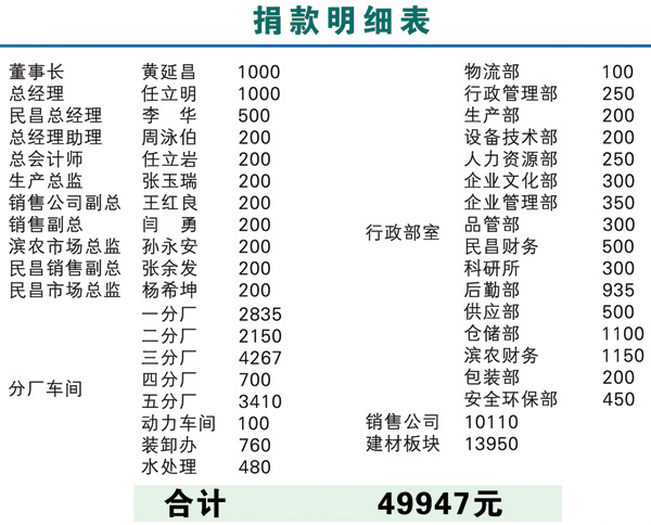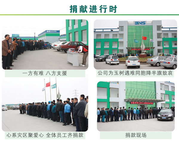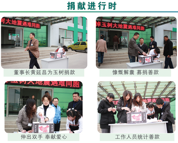 4·14青海玉樹地震發生后,我公司全體干部員工十分關注來自災區的一切消息。2010年4月21日上午10時,值此全國哀悼日,我公司黨總支、工會組織了“情系玉樹,真愛無疆”自愿捐款活動,集團董事長黃延昌、總經理任立明率先捐款,全體高中層干部在辦公樓前參加了集體捐款活動。集團公司農化、建材兩大板塊各部門、車間員工也紛紛自發捐款,集中將善款交到了企業文化部。活動結束后,累計捐款近五萬元,這批善款將用于馳援災區同胞抗震救災,重建家園。